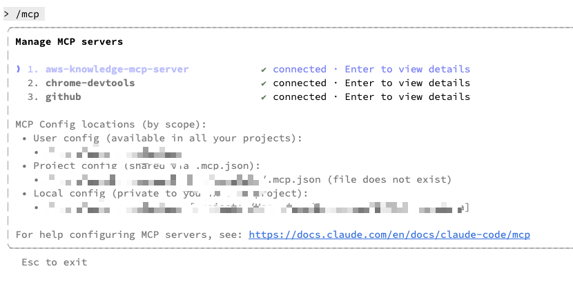 インストールが完了したら、Claudeを再起動して、/mcp